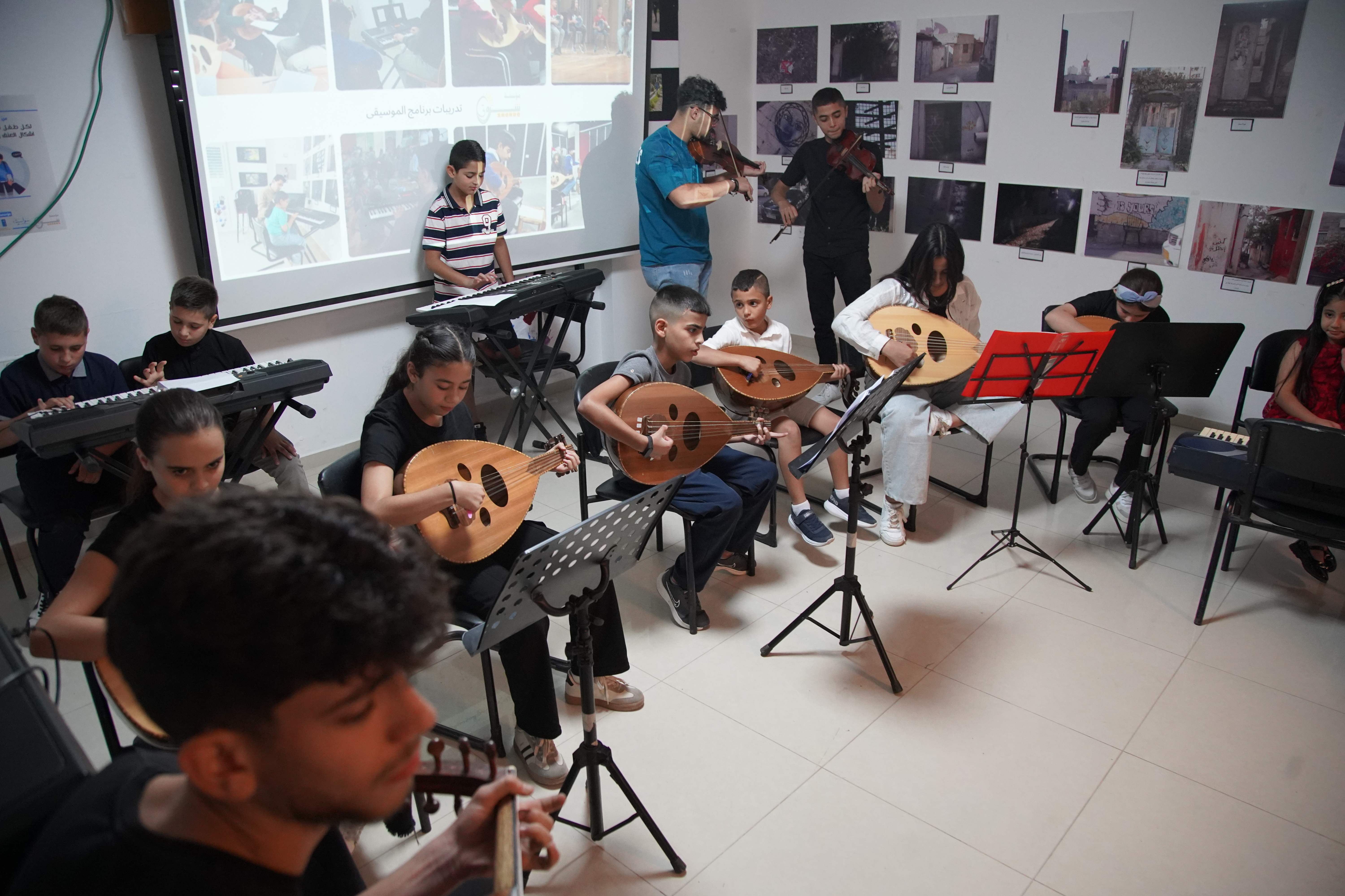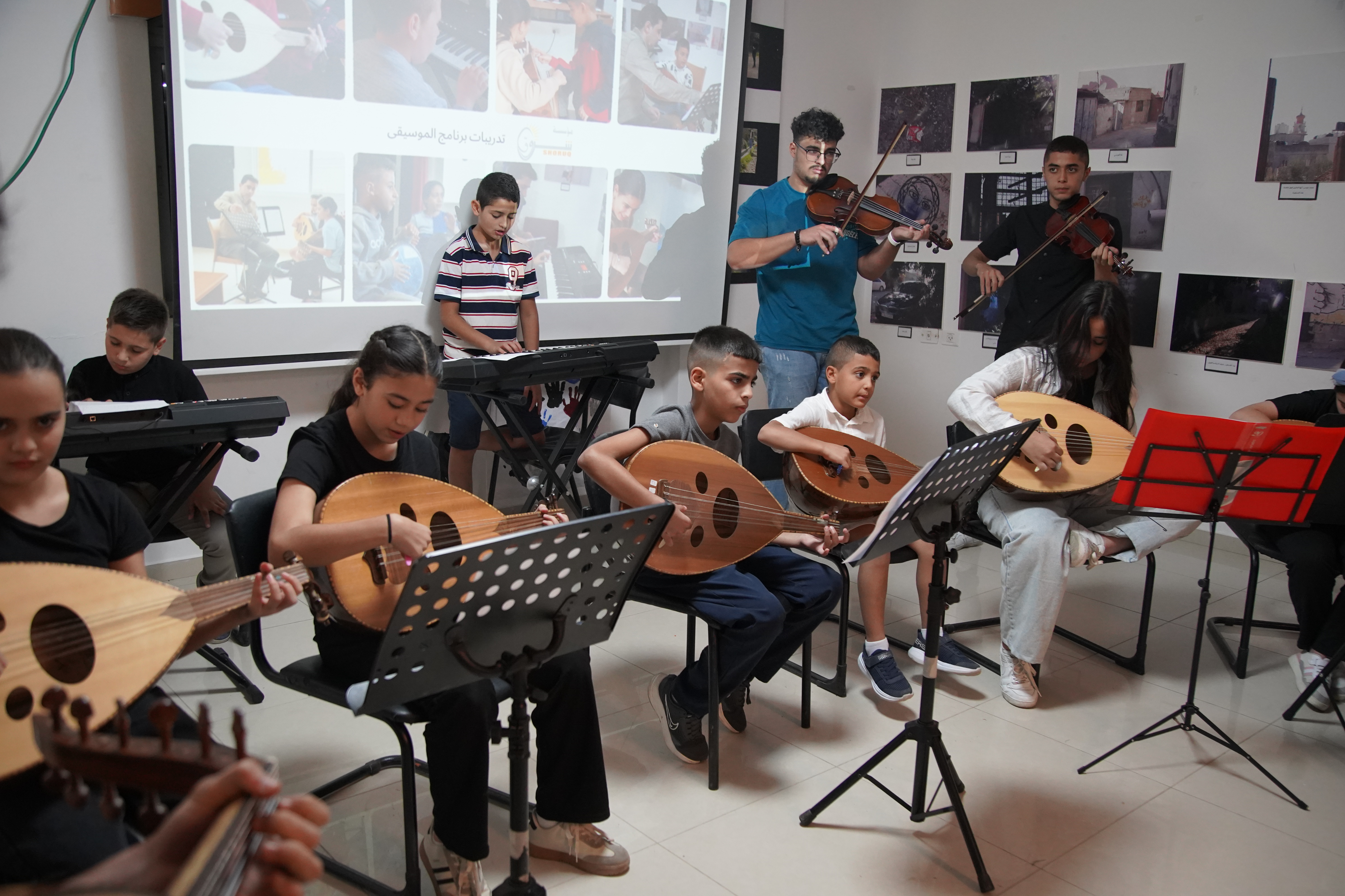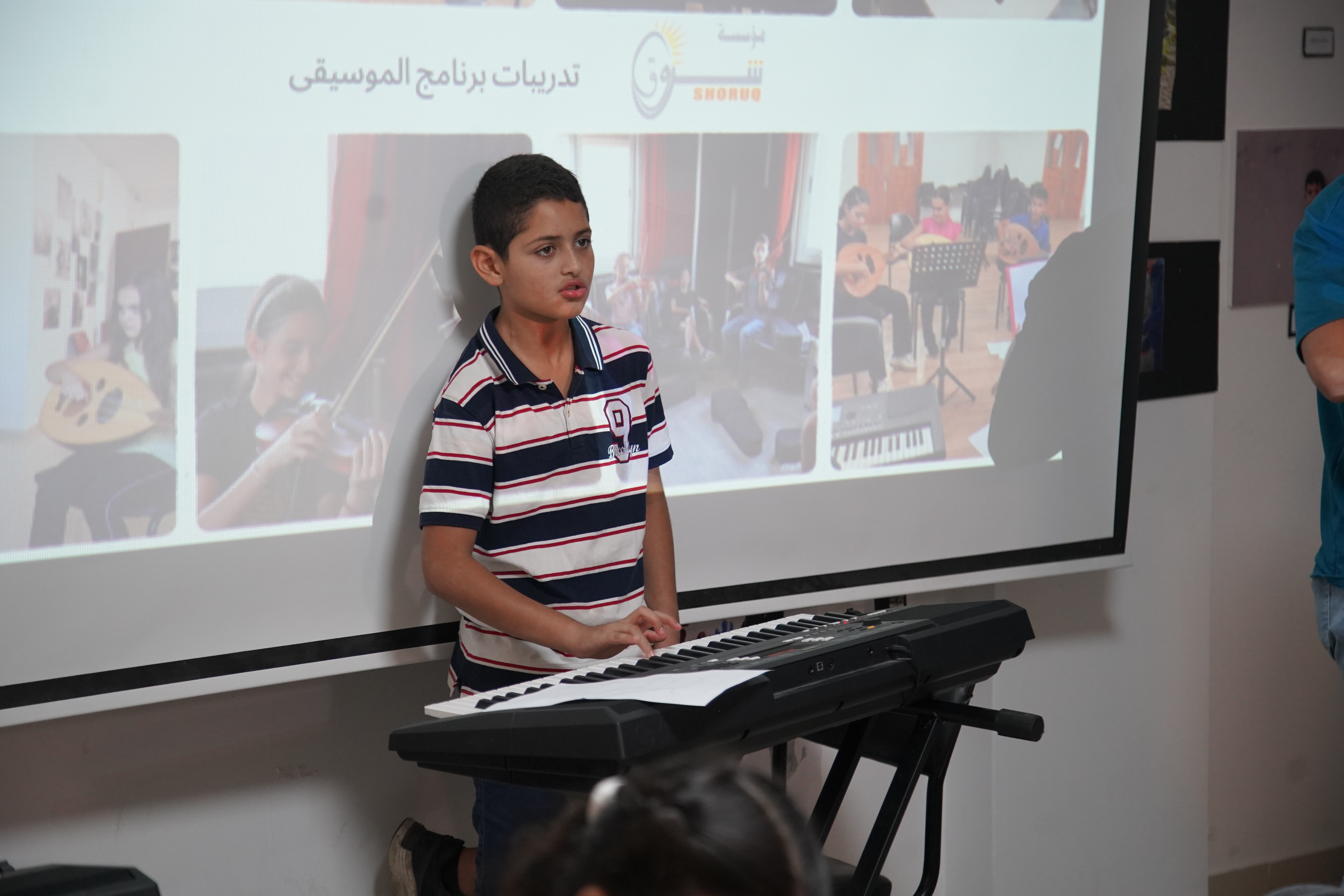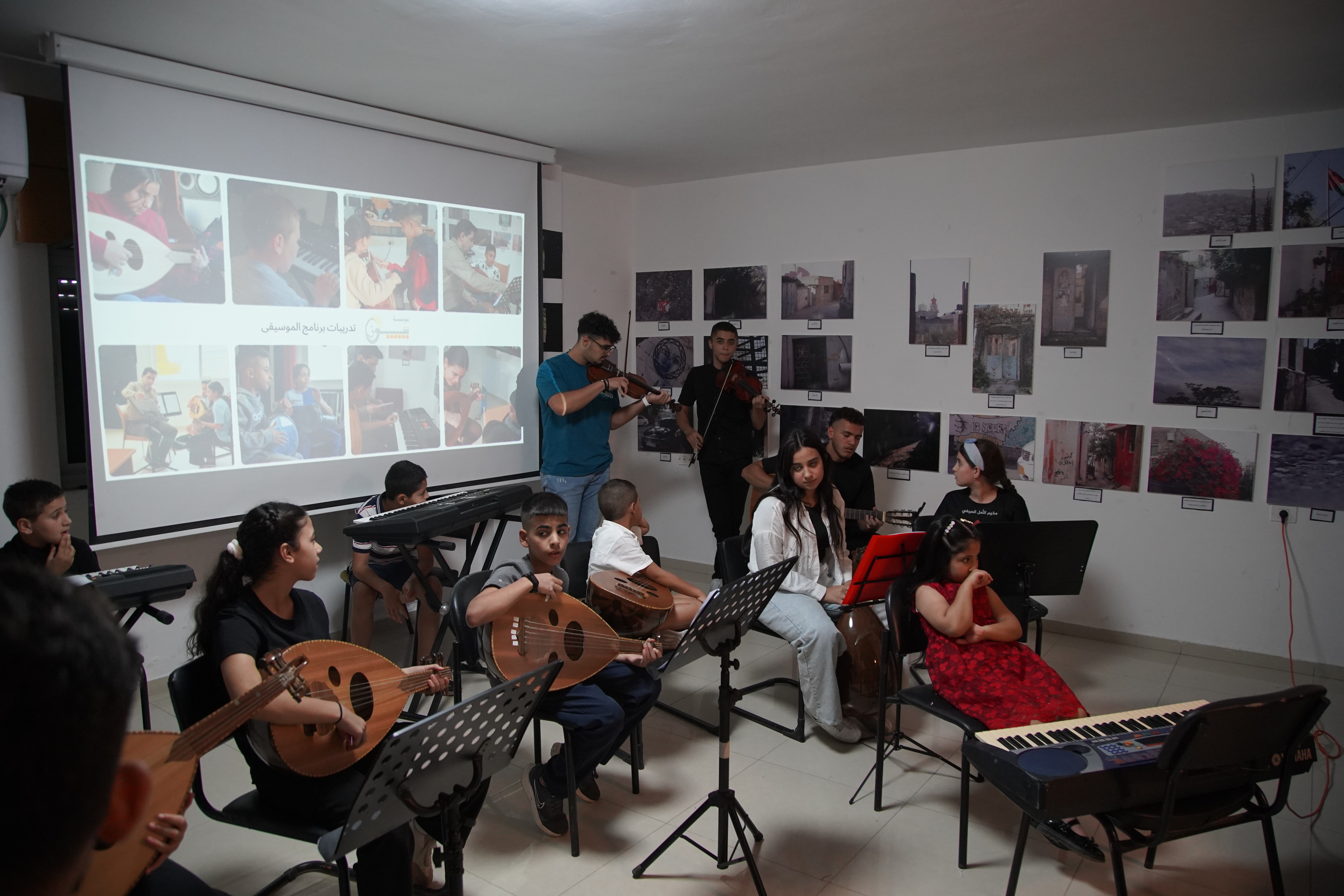 Shoruq Organization held an artistic musical evening for the music program, inviting the families of the children to witness the results of their weekly training sessions. The event featured an opening speech by Hazem Al-Qassas, the executive director of the Organization, who welcomed the families and assured them that what they would see was the fruit of the children's hard work in the program. Murad Naseem, the music teacher, also welcomed the families.