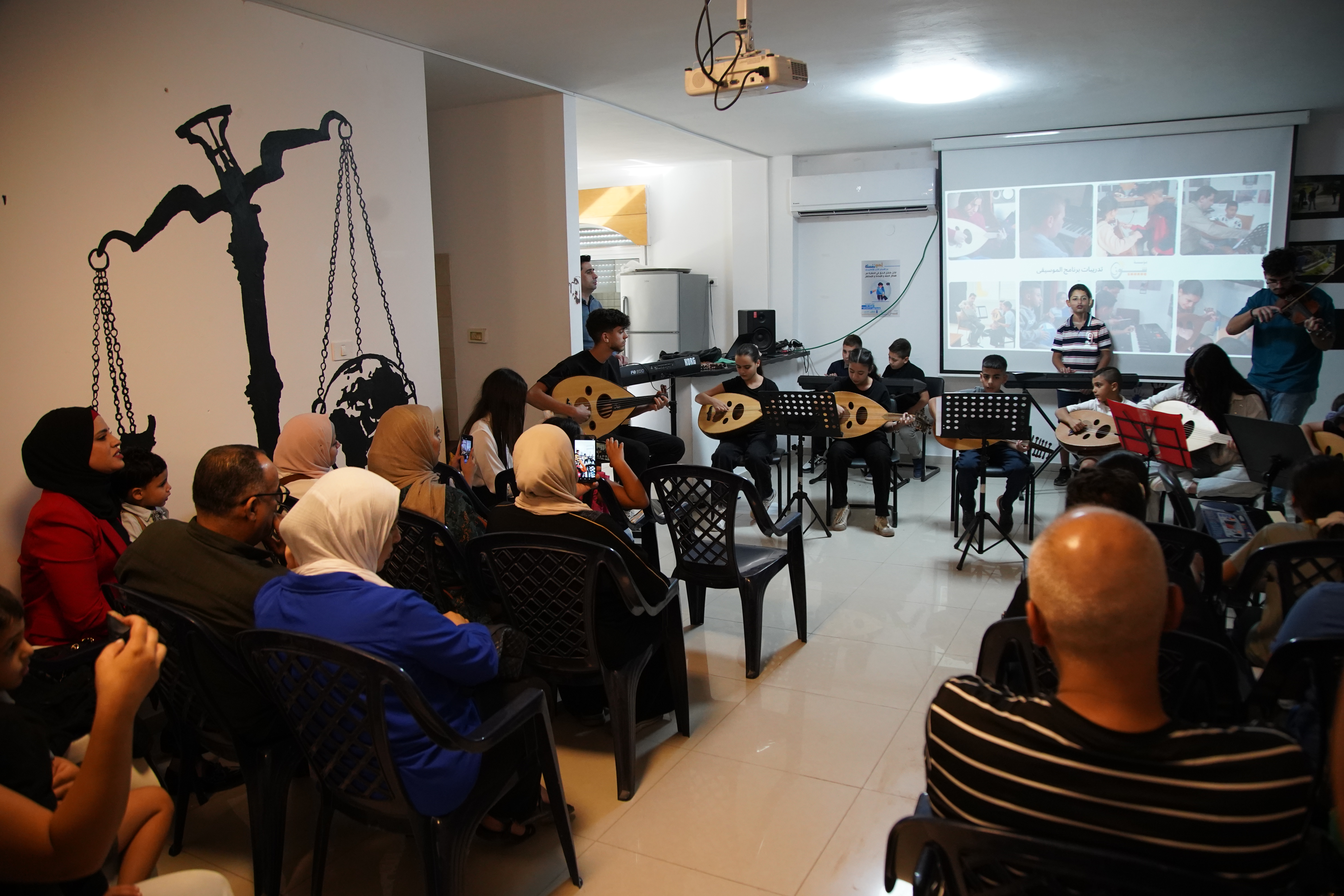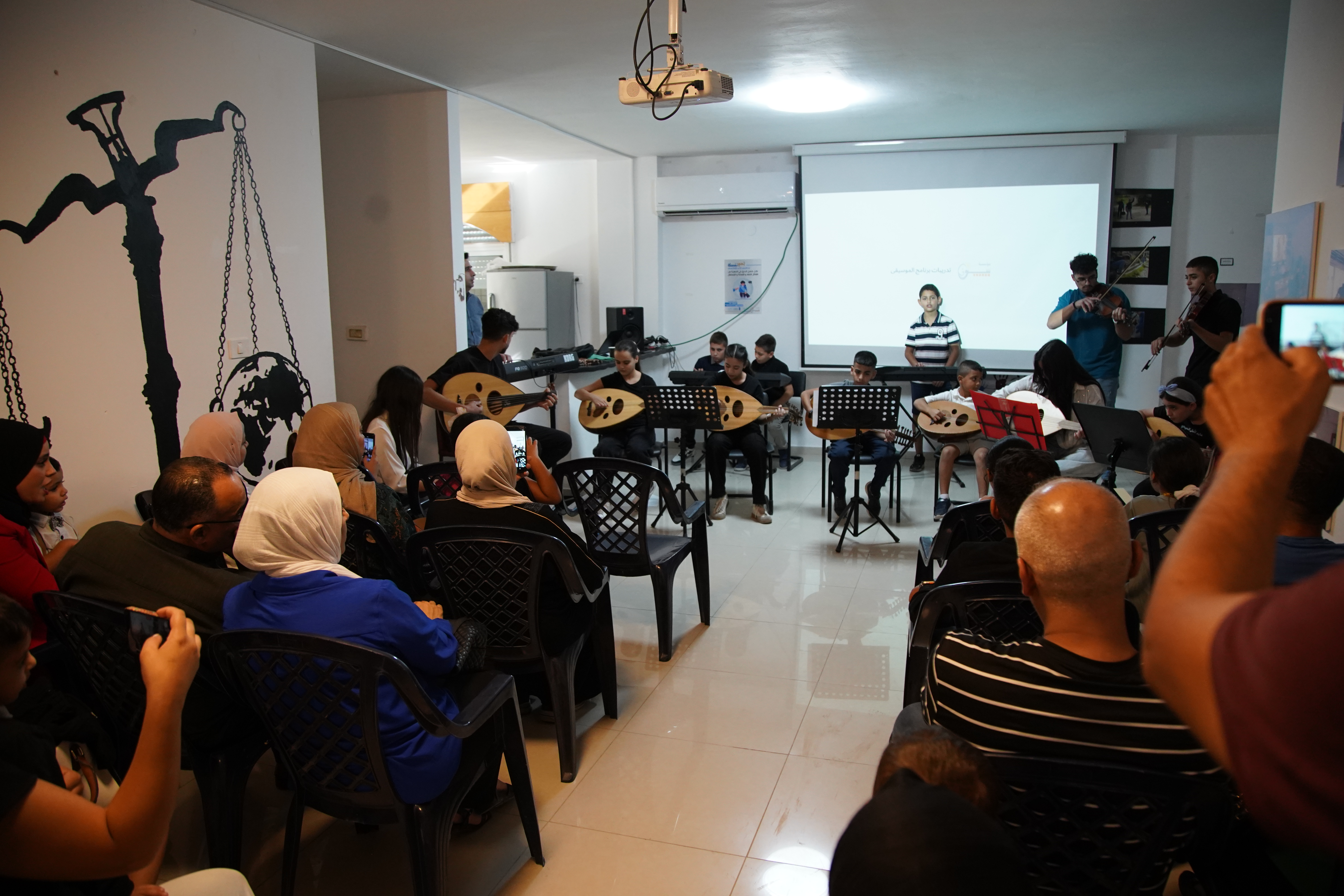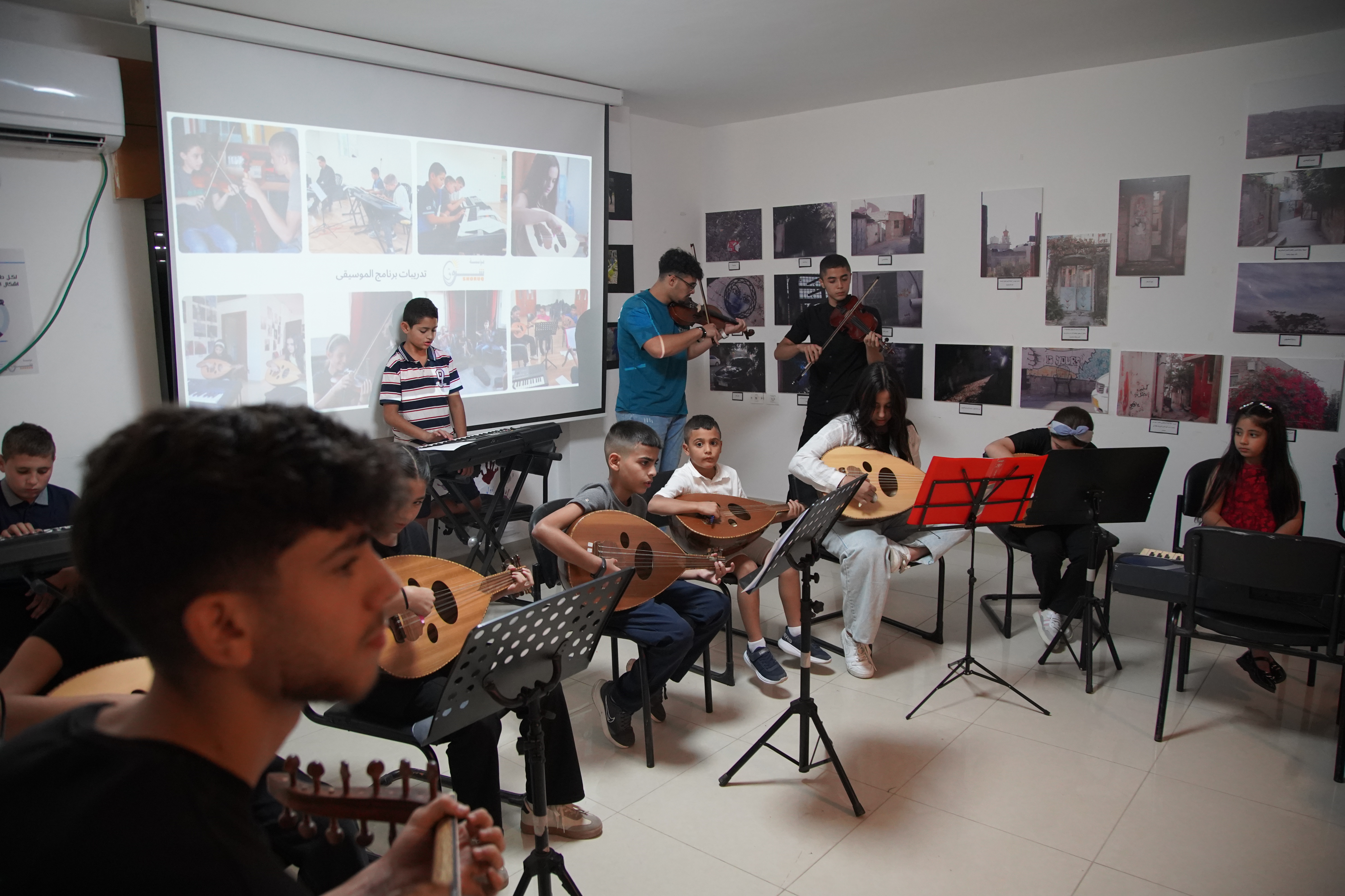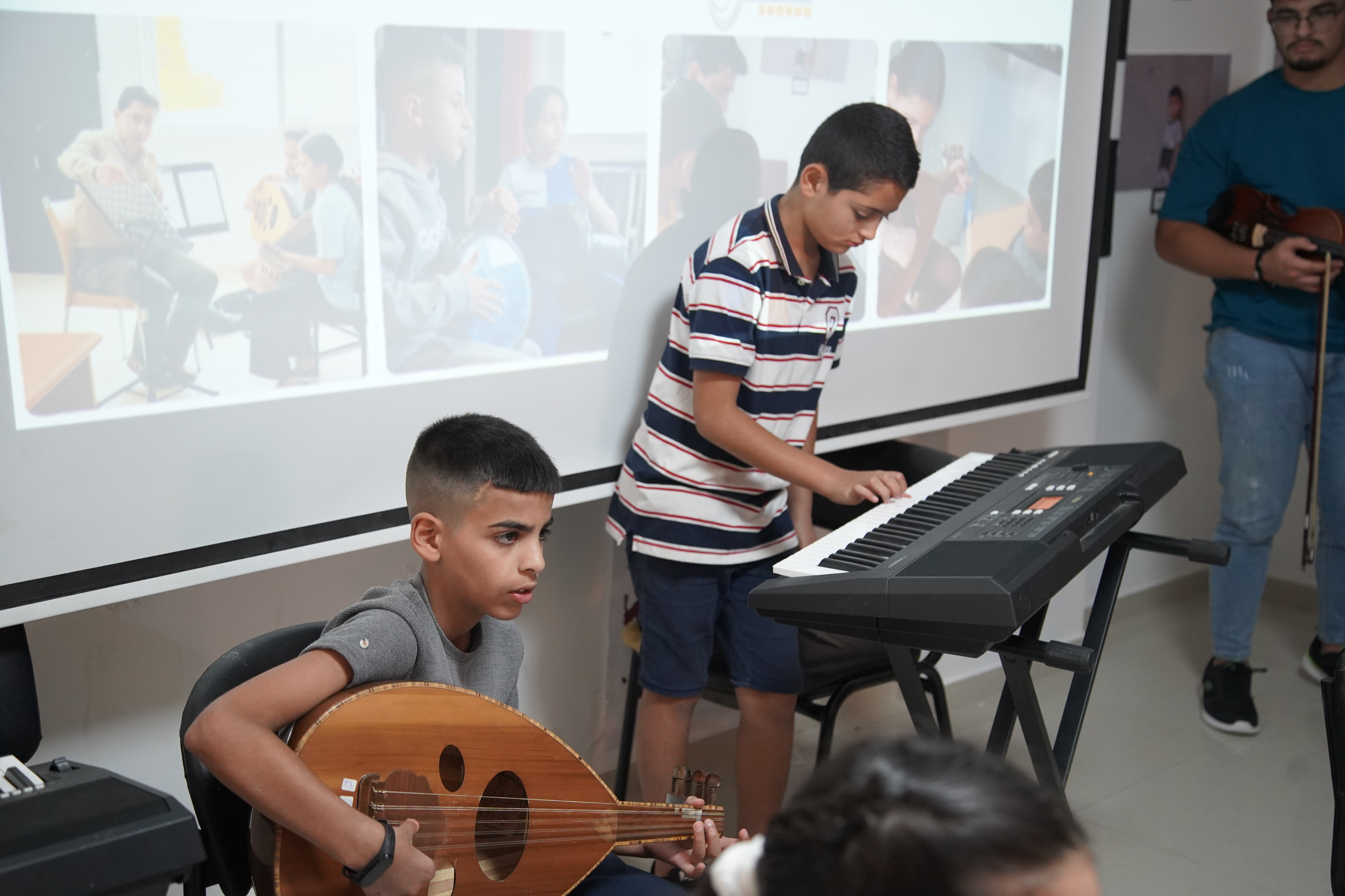 Shoruq Organization held an artistic musical evening for the music program, inviting the families of the children to witness the results of their weekly training sessions. The event featured an opening speech by Hazem Al-Qassas, the executive director of the Organization, who welcomed the families and assured them that what they would see was the fruit of the children's hard work in the program. Murad Naseem, the music teacher, also welcomed the families.