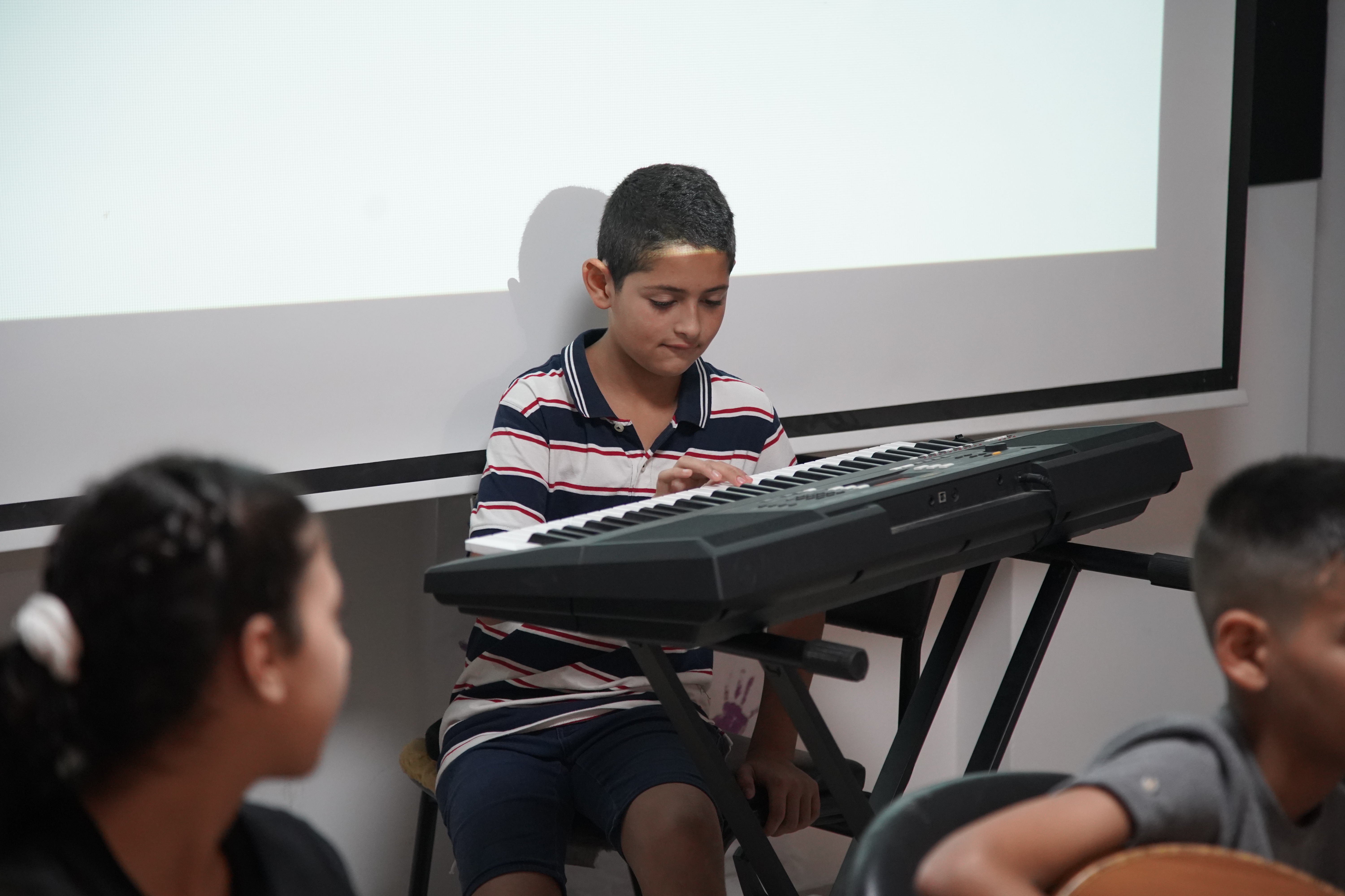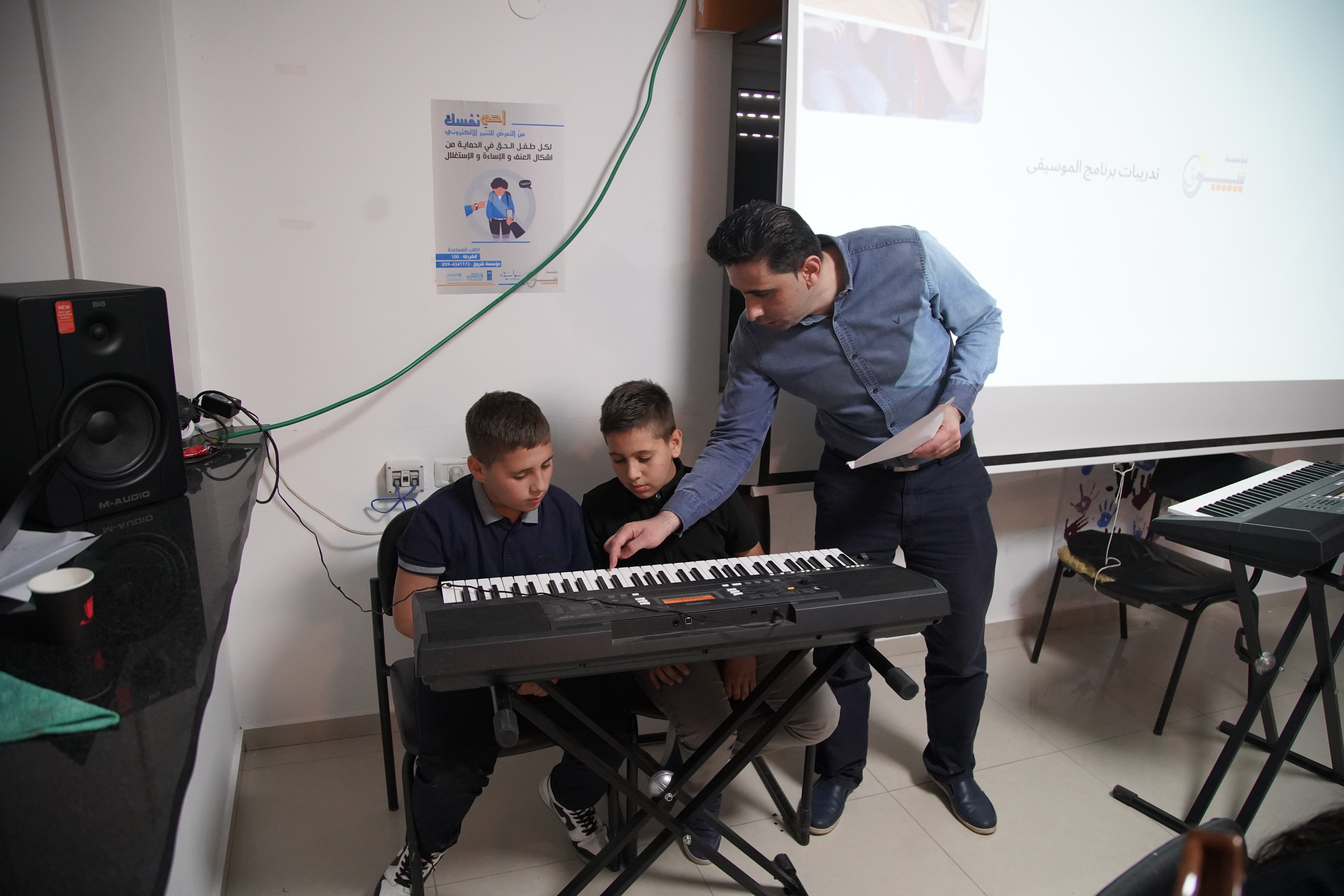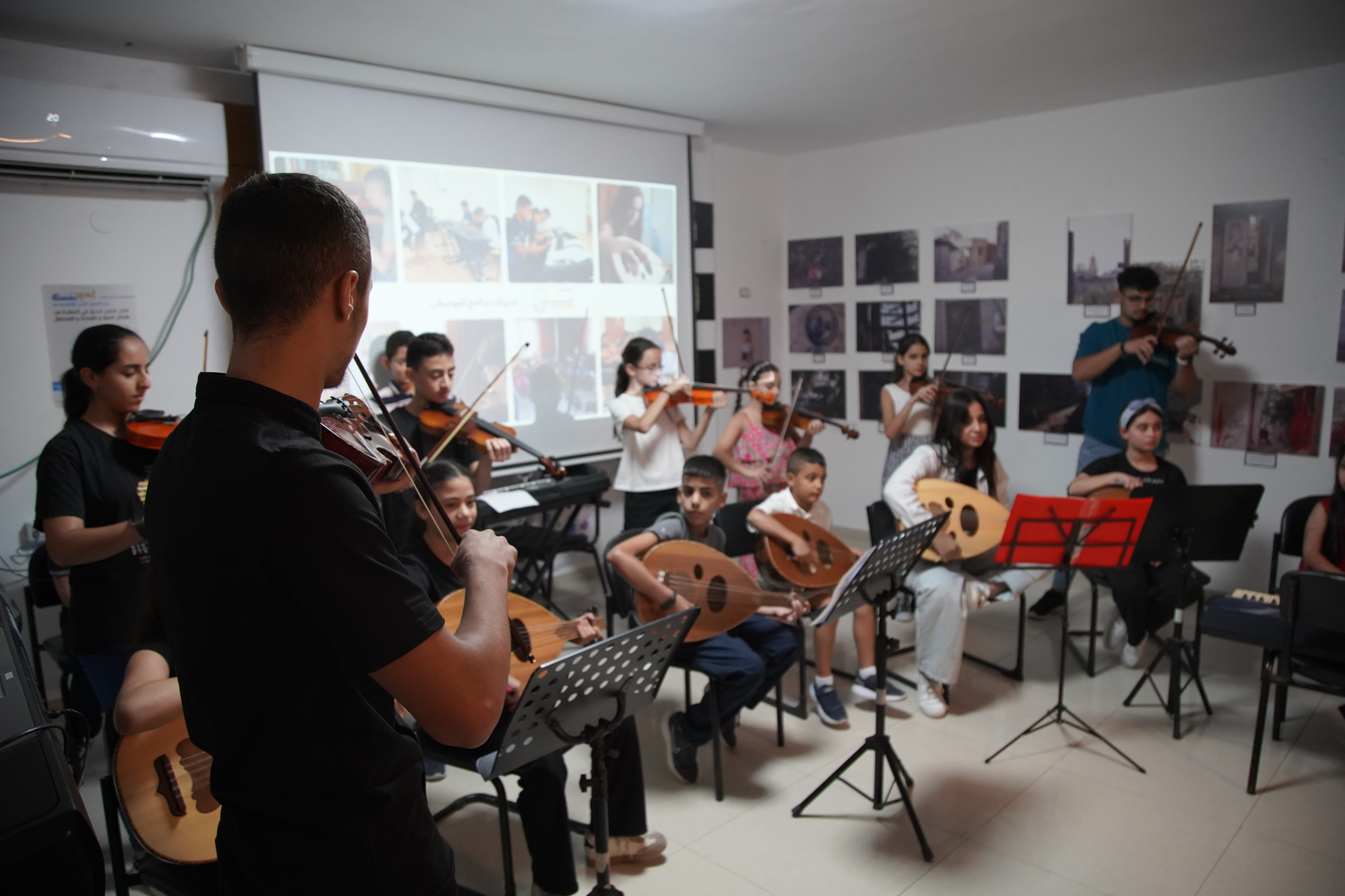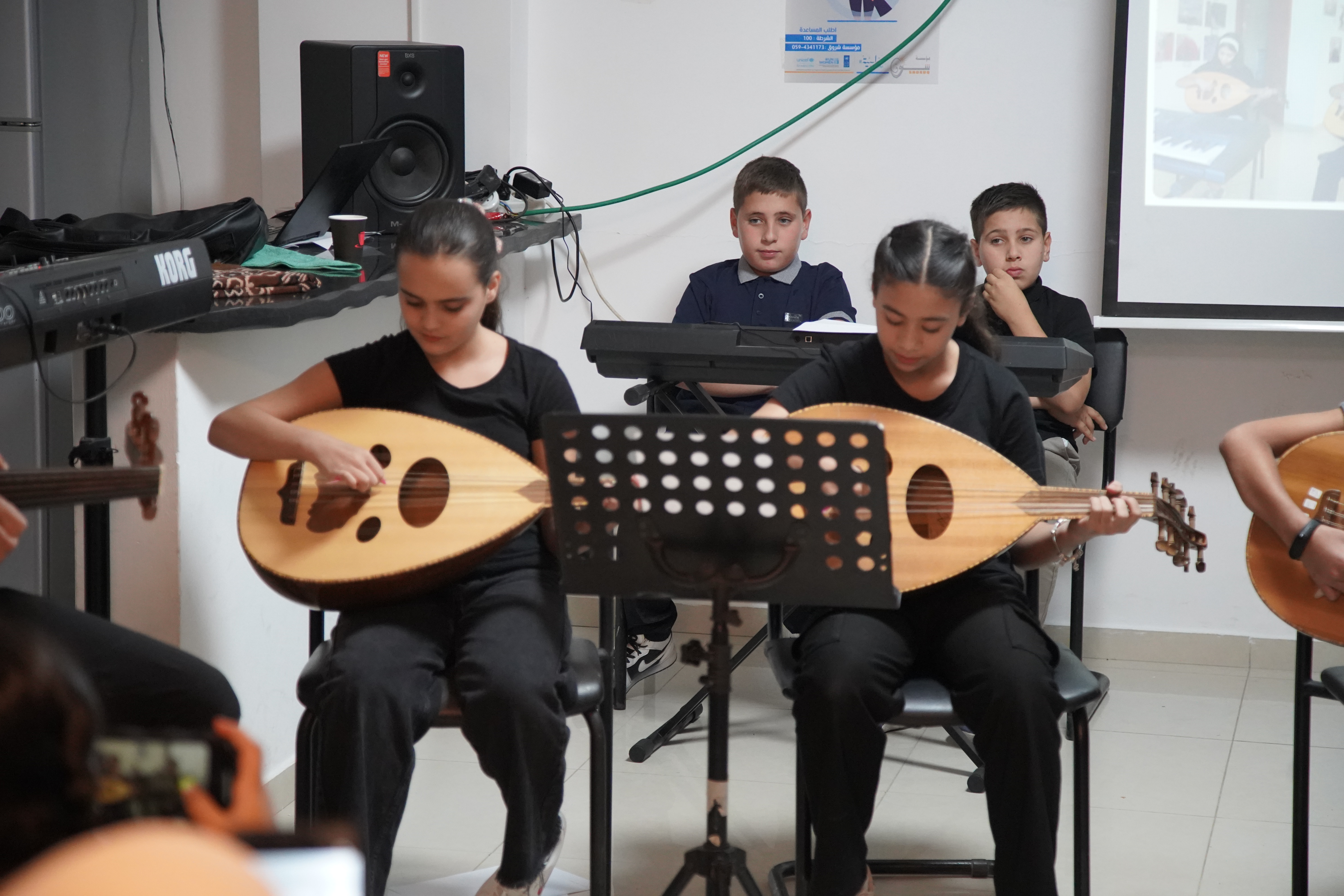 Shoruq Organization held an artistic musical evening for the music program, inviting the families of the children to witness the results of their weekly training sessions. The event featured an opening speech by Hazem Al-Qassas, the executive director of the Organization, who welcomed the families and assured them that what they would see was the fruit of the children's hard work in the program. Murad Naseem, the music teacher, also welcomed the families.